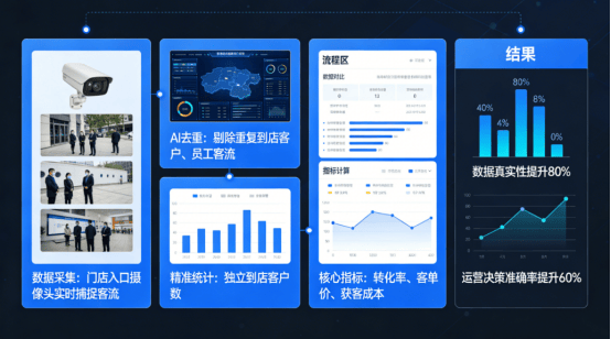 通过 AI 去重能力剔除重复到店客户、员工客流,精准统计独立到店客户数,彻底解决数据虚高问题,让转化率、客单价、获客成本等核心指标的计算精准可控,为门店运营决策提供真实可靠的数据依据。