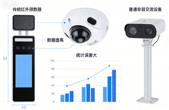 2. 场景适配能力不足,统计误差大:传统设备单台覆盖宽度不足 5 米,无法适配家居门店宽大门头,多人并排、推车遮挡、强光逆光场景下,漏计率超 10%,夜间 / 阴雨天准确率骤降;