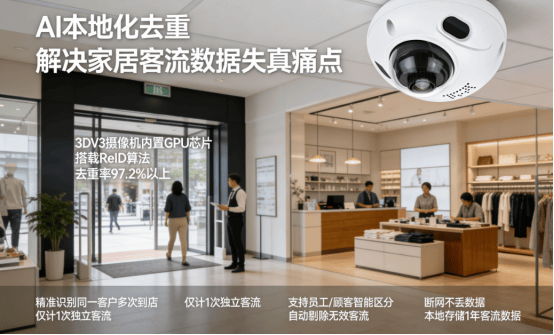 A:完全可以。动恰 3DV3 内置 GPU 芯片,搭载 ReID 深度学习算法,可在本地完成 AI 去重,去重率达 97.2% 以上,同一客户多次出入门店、多次到店均可精准识别,仅计 1 次独立客流,无需依赖云端,断网状态下也能正常实现去重功能,彻底解决家居建材行业客户决策周期长、多次到店导致的客流数据虚高问题。